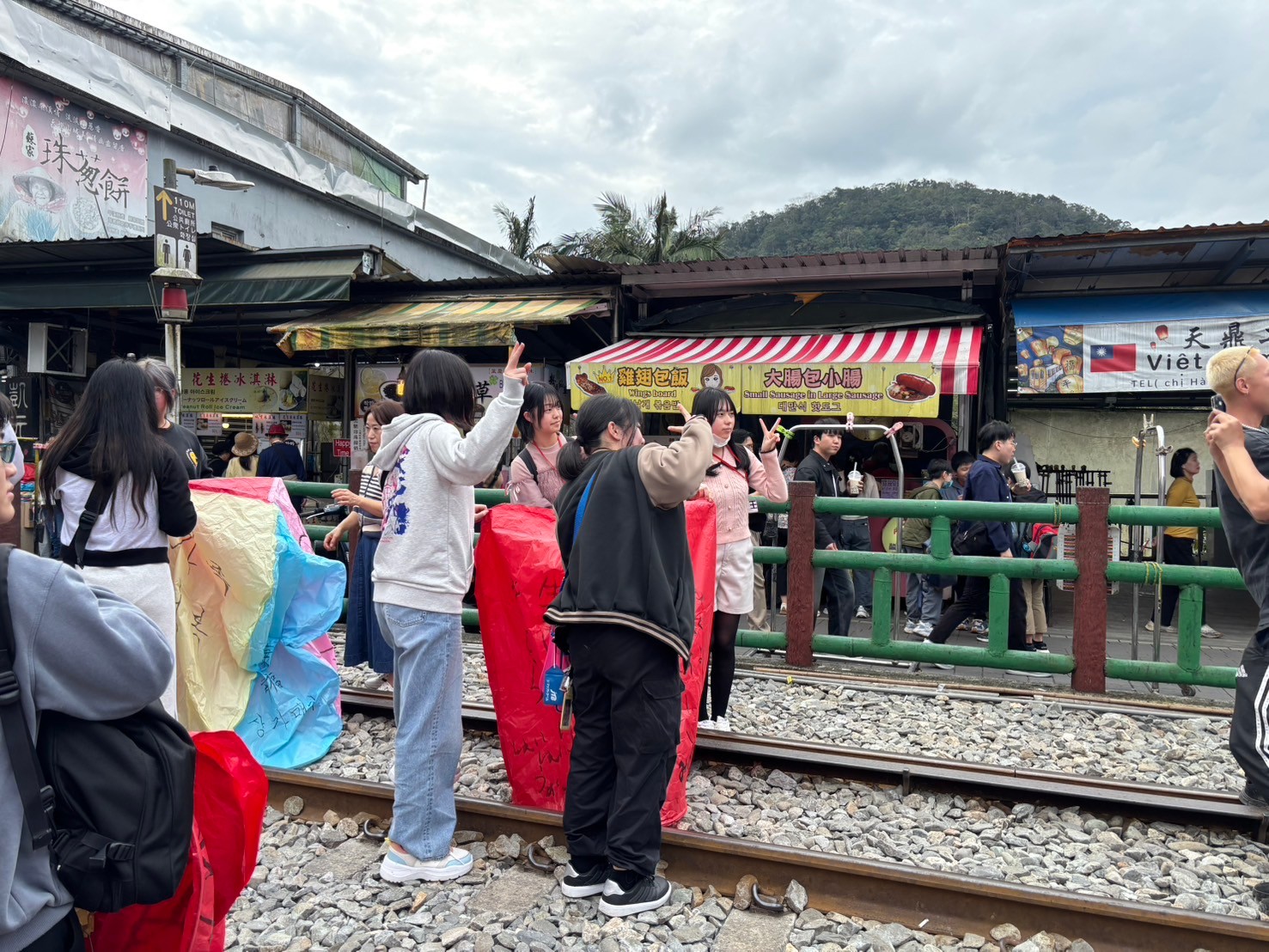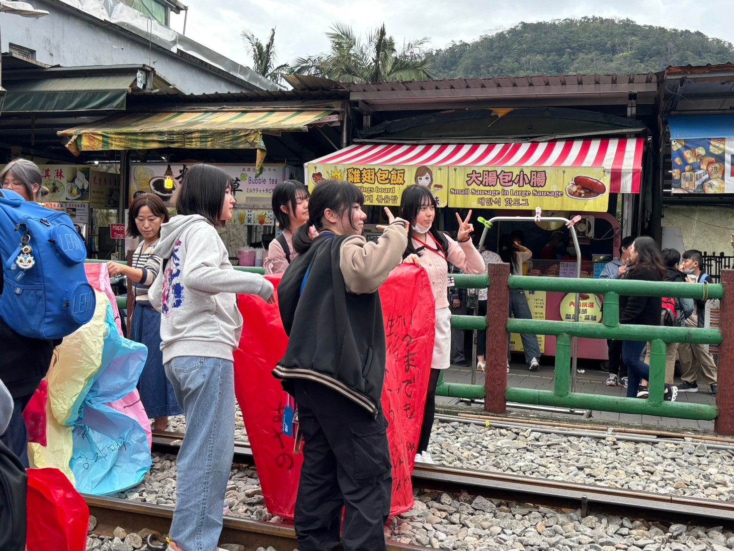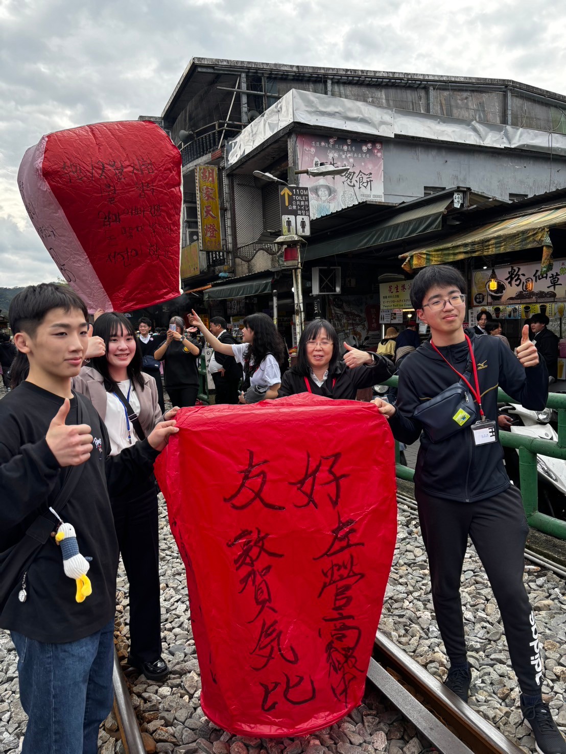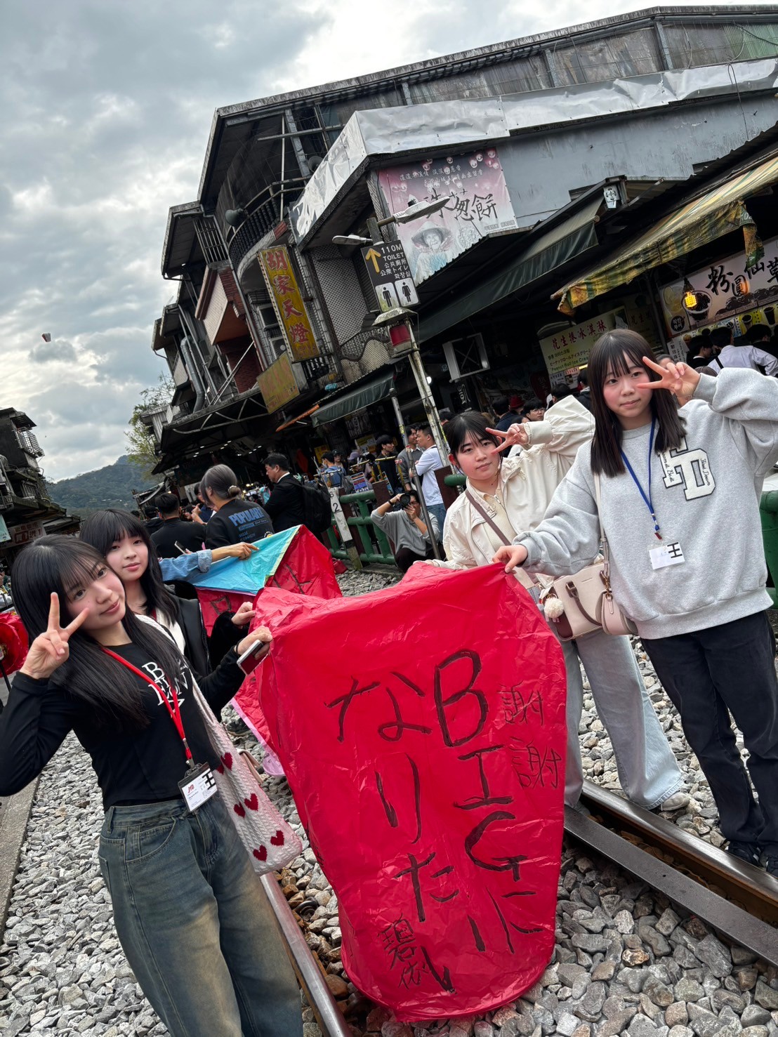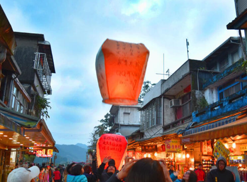 台湾の十分では天燈(ランタン)あげが有名です。みんなそれぞれ天燈を作りました。1枚目の写真のようにきれいにあがります。