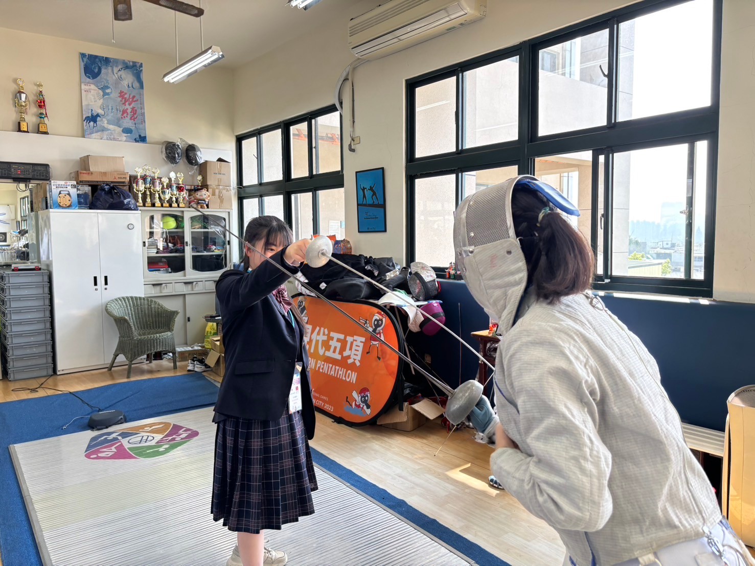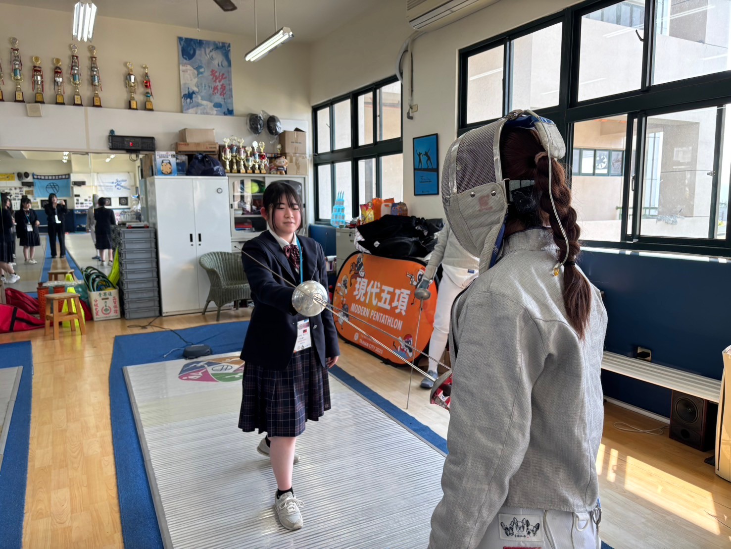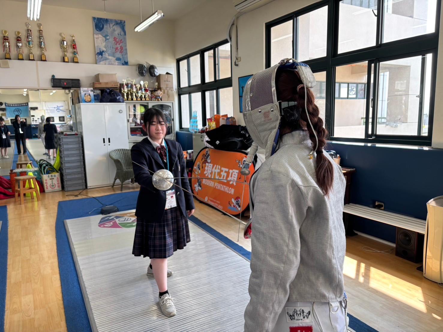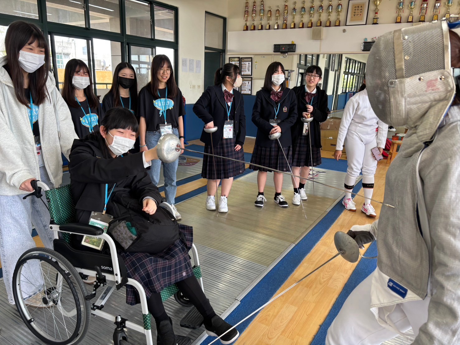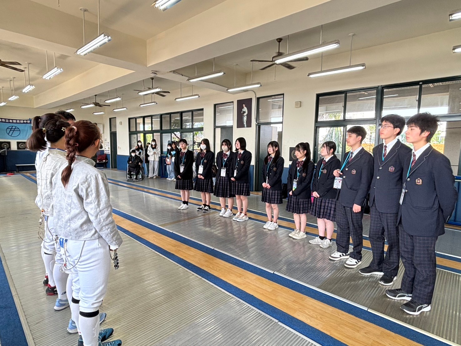 2日目は佐營高級中学校との交流活動です。部活動体験では、フェンシング、射撃を体験しました。佐營高級中学校のみなさんと一緒に給食を食べ、午後は本校のユネスコスクールの活動を紹介しました。レクリエーションやグループ交流を行いました。